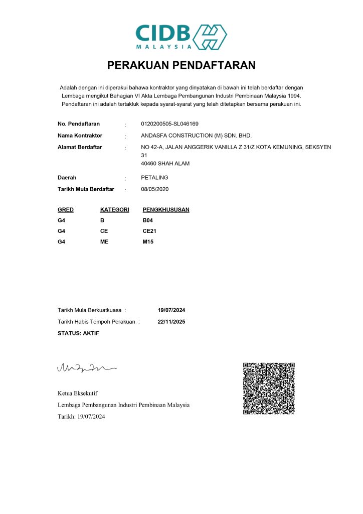 Pada tahun 2020, Andasfa Construction (M) Sdn. Bhd. telah melangkah satu langkah besar dengan mendapatkan pendaftaran sah di bawah Lembaga Pembangunan Industri Pembinaan Malaysia (CIDB). Bermula dengan tekad untuk menyediakan perkhidmatan pembinaan yang terbaik, syarikat ini kini tersenarai sebagai kontraktor Gred G4 dengan kepakaran dalam bidang bangunan (B04), kejuruteraan awam (CE21), dan mekanikal (M15).